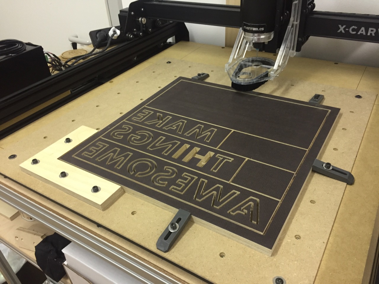 Die Schrift wurde in ein Rest 40 x 40 x 1,5cm Siebdruckplatte gefräst.