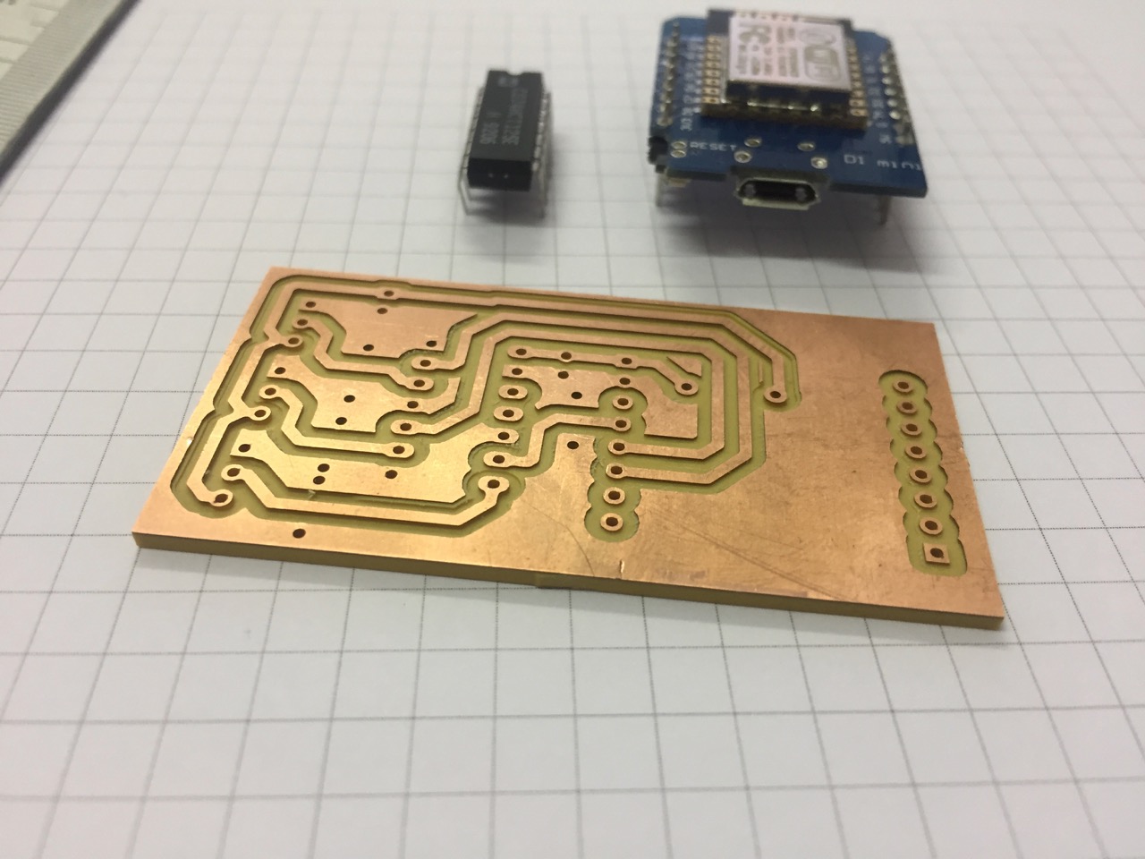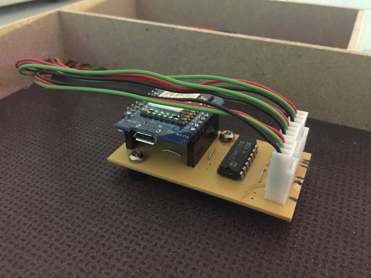 Im innern stecken wieder WS2812-LEDs, welche über einen Wemos D1 Mini angesteuert werden. Dafür habe ich eine kleine Platine gefräst, welche den Wemos D1, einen 4-fach Logiclevel Converter sowie drei Konnektoren aufnimmt.
